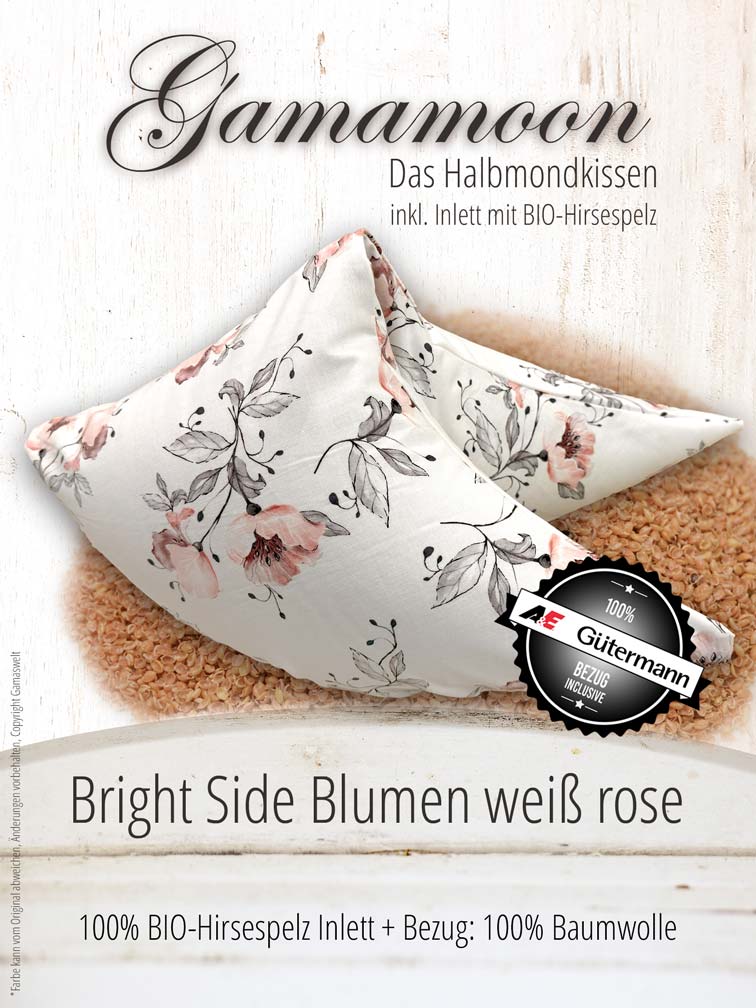 Gamamoon Nackenkissen / Halbmondkissen in der Bezugsvariante Bright Side Blumen weiß rose.