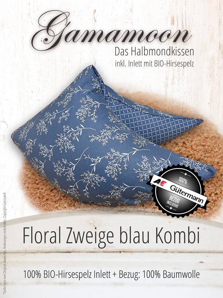 Gamamoon Nackenkissen / Halbmondkissen in der Bezugsvariante Floral Zweige blau Kombi.