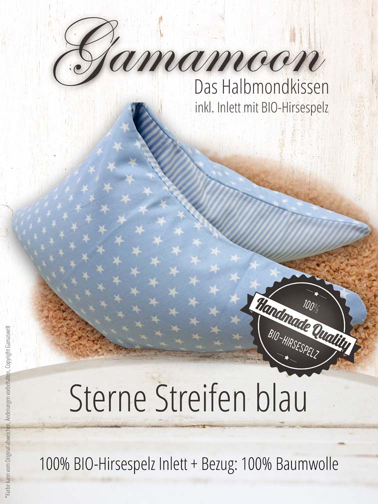 Gamamoon Nackenkissen / Halbmondkissen in der Bezugsvariante Sterne Streifen blau.
